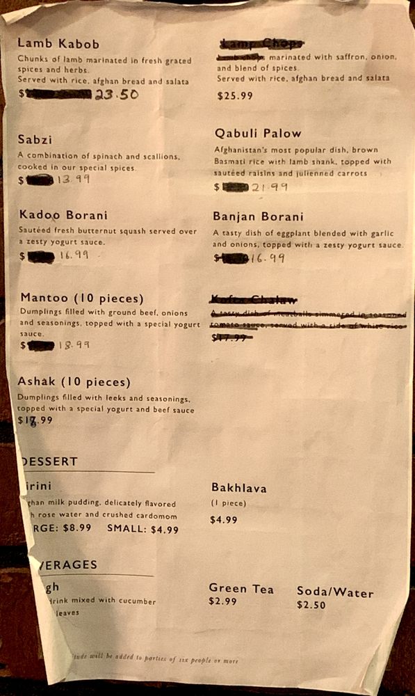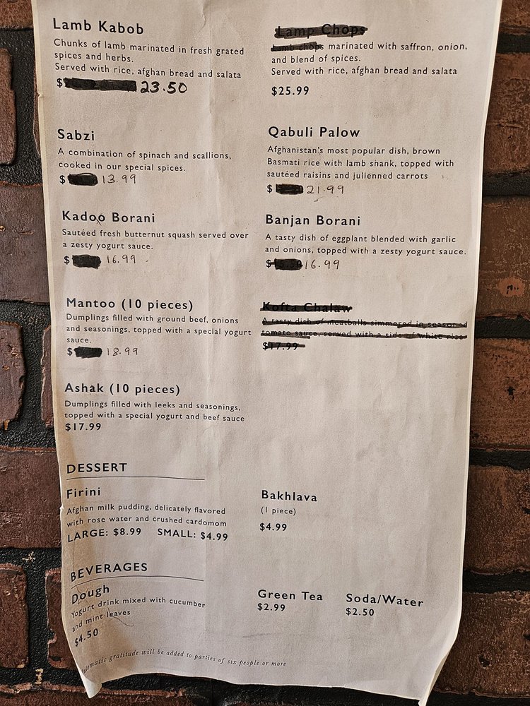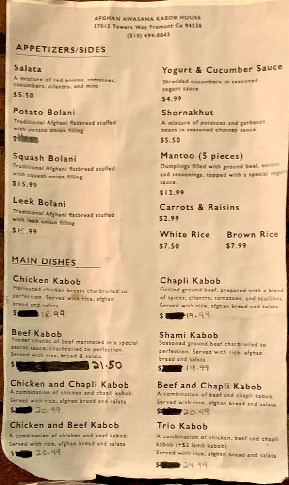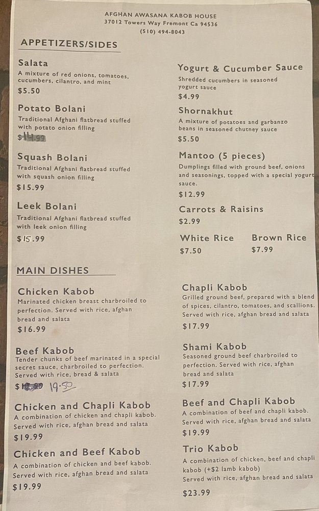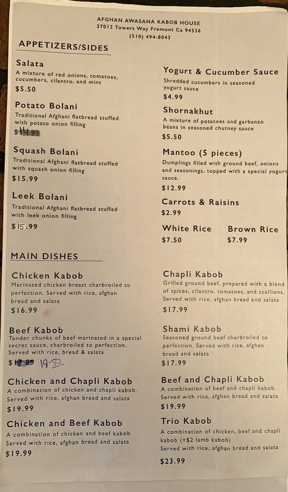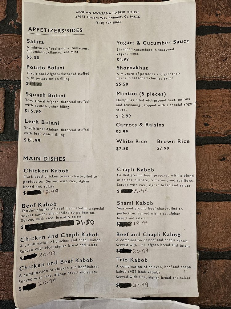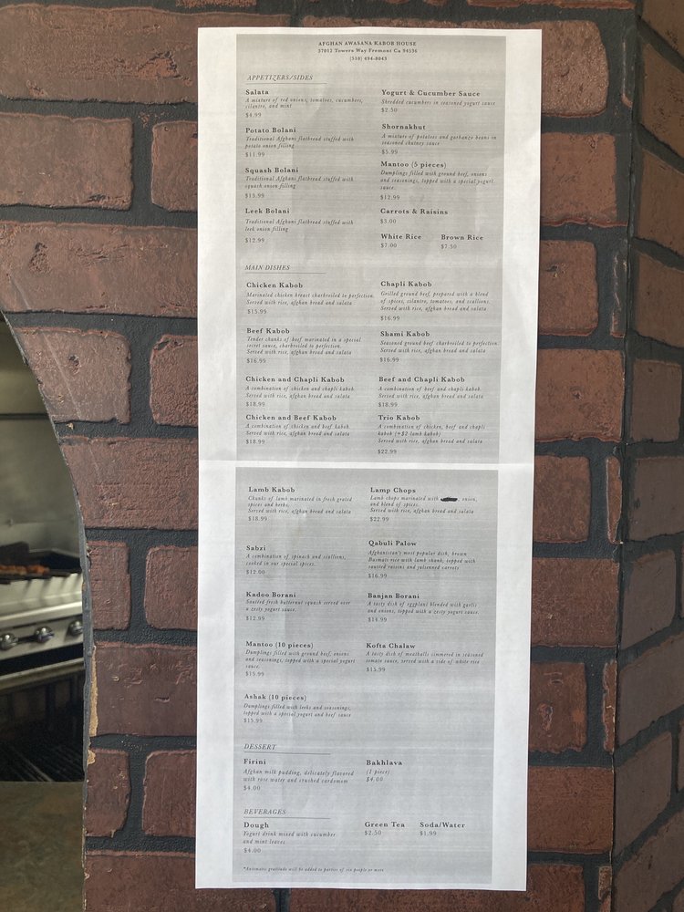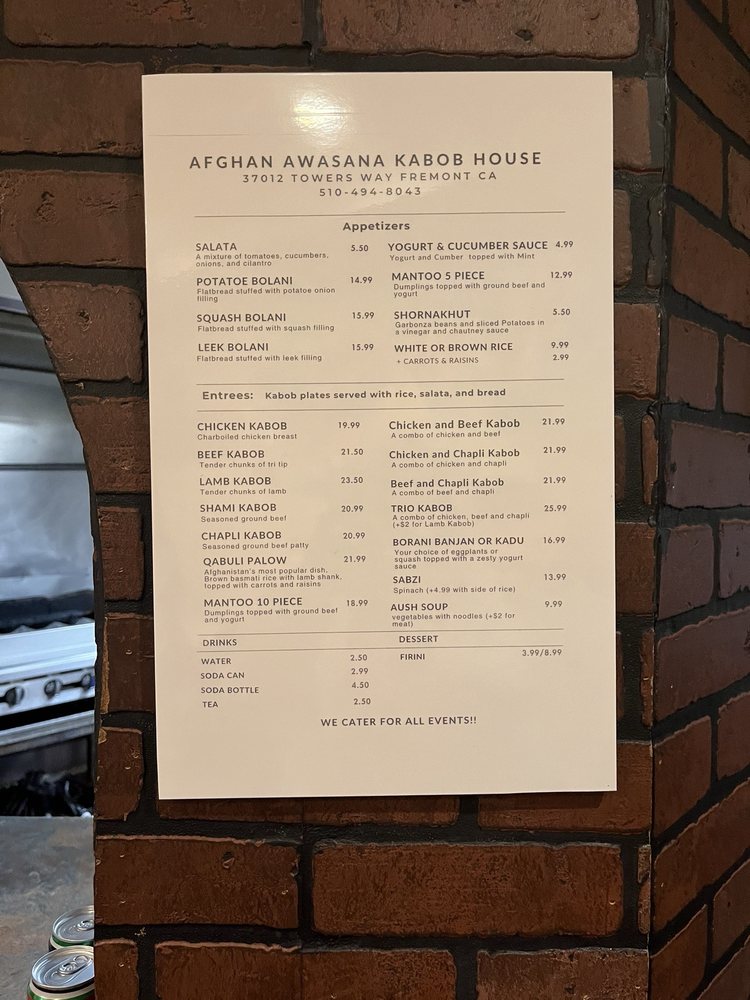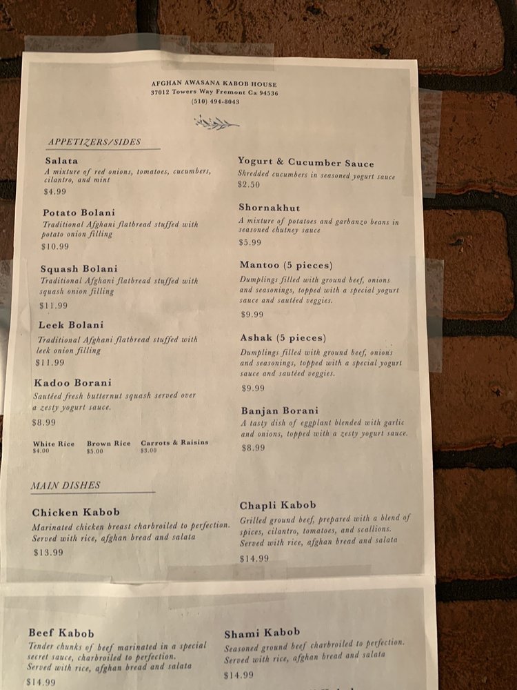Afghan Awasana Kabob offers a diverse menu of Halal cuisine in a cozy and welcoming setting. Nestled in Fremont, CA, this women-owned establishment provides a range of dining options, from takeout and delivery to catering services. Customer reviews rave about the flavorful dishes, such as the crispy bolani, juicy chicken kabobs, and tender lamb shank. The Qabuli palow is a crowd favorite, with a mix of sweet carrots and raisins adding a unique twist. The menu may be compact, but each item is perfected to delight your taste buds. The warm hospitality and fresh ingredients make every visit a memorable experience. Whether you're a fan of Afghan cuisine or a newcomer, Afghan Awasana Kabob is sure to impress with its authentic flavors and generous portions. Don't miss out on this hidden gem in Fremont!